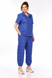 Комплект женский брючный, состоящий из блузки и брюк. Блузка рубашечного покроя с коротким втачным рукавом с манжетой по низу рукава. Свободная, с фигурным низом, комбинированная из двух видов ткани: с вышивкой и однотона. По переду блузки застёжка на планки с пуговицами, воротничок небольшой рубашечный. Брюки "алладины", свободные 7/8 длины, на поясе с эластичной тесьмой, по низу брюк тоже манжета с эластичной тесьмой, свободная. Брюки на подкладке из х/б ткани в тон. Параметры: ОГ (48):54см (50):56см (52):58см (54):60см (56):62см (58):64см ОБ блуза(48):57см брюки:56см блуза(50):59см брюки:58см блуза(52):61см брюки:60см блуза(54):63см брюки:62см блуза(56):65см брюки:64см блуза(58):67см брюки:66см ОТ (48):39см (50):41см (52):43см (54):46см (56):48см (58):50см Блуза- 67-68см брюки-94см