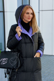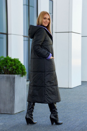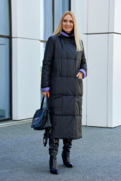 Пальто женское из плащевой ткани на утеплителе нового поколения "изософт", двухстороннее, двухцветное. Пальто прямого покроя, удлиненное, с втачным двухшовным рукавом с отложной манжетой по низу, по переду-карманы в горизонтальных рельефных швах, изделие двубортное, застегивается на кнопки, с капюшоном. Рекомендуется носить при температуре -10 и до -20 градусов. Ширина по линии груди (42):56см (44):58см (46):60см (48):62см (50):64см (52):66см (54):68см (56):69см (58):71см (60):73см Ширина по линии бедер (42):58см (44):60см (46):62см (48):64см (50):66см (52):68см (54):70см (56):71см (58):73см (60):75см Длина изделия 122-124см Длина рукава 64см