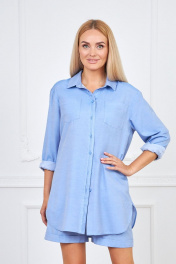 Комплект женский,состоящий из блузки и шорт.Блузка удлиненная ,ниже линии бедер ,свободного покроя,с рубашечным рукавом на манжете по низу.Шорты свободные ,спереди на поясе , по спинке -с эластичной тесьмой,с боковыми карманами, по низу шорт -манжеты отложенные. Ширина по линии груди блузка(42):54см блузка(44):56см блузка(46):58см блузка(48):60см блузка(50):62см блузка(52):64см Ширина по линии бедер блузка (42):55см, шорты(42) :51см блузка (44):57см, шорты(44):53см блузка (46):59см, шорты(46):55см блузка (48):61см, шорты(48):57см блузка (50):63см, шорты(50) 59см блузка(52):65см, шорты(52) :61см Ширина по линии талии шорты(42):36см шорты(44):38см шорты(46):40см шорты(48):42см шорты(50):44см шорты(52):46см Длина изделия Блузка(42-52)81см Шорты(42-52) 45см Длина рукава 56см