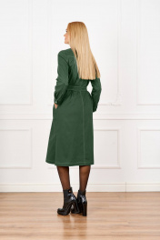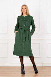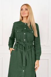 Платье женское из тонкой джинсовой ткани с хлопком. Прямого силуэта под пояс из той же ткани, вырез горловины круглый, рукав втачной на манжете по низу, застежка спереди на планку с пуговицами, на уровне линии груди накладные карманы с клапаном, ниже линии талии- карманы, по боковым швам разрезы, по спинке средний шов. Ширина по груди (44):52см (46):54см (48):56см (50):58см (52):60см (54):62см Ширина по бедрам (44):56см (46):58см (48):60см (50):62см (52):64см (54):66см Длина изделия 110см Длина рукава 60см