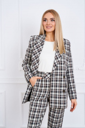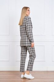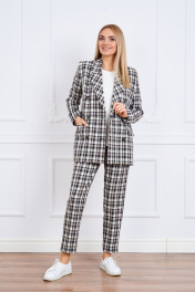 1Комплект женский, состоящий из жакета, брюк и джемпера . Жакет свободного полуприлегающего силуэта с втачным рукавом, воротник отложной, застежка 2-бортная на петли и пуговицы ,по переду карманы с клапаном ,изделие на подкладке. .Джемпер из трикотажного полотна с коротким рукавом с круглым вырезом горловины, свободный,удлиненный. Брюки прямые,свободные,7/8 длины разрезами по низу брюк,на поясе с эластичной теьмой ,с карманами по передним половинкам брюк. Ширина по линии груди жакет(44):49см, джемпер:49см жакет(46):51см, джемпер :51 см жакет(48):53см джемпер:53см жакет(50):55см джемпер:55 см жакет(52):57см джемпер :57см жакет(54):59см джемпер 59 см жакет(56):61см джемпер :61 см жакет(58):63см джемпер:63см жакет(60):65см джемпер :65 см Ширина по линии бедер жакет(44):51см, брюки:52см ,джемпер:51см жакет(46):53см, брюки:54см , джемпер:53см жакет(48):55см, брюки:56см, джемпер:55см жакет(50):57см ,брюки:58см , джемпер:57см жакет(52):59см, брюки:60см, джемпер:59см жакет(54):61см ,брюки:62см, джемпер :61см жакет(56):63см,брюки:64см, джемпер :63см жакет(58):65см, брюки:66см, джемпер :65см жакет(60):67см ,брюки:68см, джемпер:67см Ширина по линии талии брюки(44):35см брюки(46):37см брюки(48):39см брюки(50):41см брюки(52):43см брюки(54):45см брюки(56):47м брюки(58):49см брюки(60):51см Длина изделия размеры:( 44-48) Жакет 75см Джемпер 61см Брюки: 95см размеры (50-54) Жакет :75,5см Джемпер :63 см Брюки :95см размеры (56-60) Жакет : 76см Джемпер : 65-66см Брюки : 95см Длина рукава Жакет :62см ,джемпер 61-66см