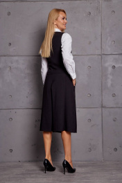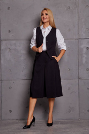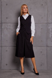 Комплект женский, состоит из жилета и юбки-брюк. Жилет укороченный, прилегающего силуэта, застёжка спереди на пуговицы, по переду и спинке вертикальные рельефы, по переду карманы-"обманки", изделие на подкладке. Юбка-брюки со складками от пояса, с боковыми карманами, застёжка по боковому шву на потайную молнию. Ширина по линии груди (42):44см (44):46см (46):48см (48):50см (50):52см (52):54см Ширина по линии бедер жилет(42):48см брюки:48см жилет(44):50см брюки:50см жилет(46):52см брюки:52см жилет(48):54см брюки:54см жилет(50):56см брюки:56см жилет(52):58см брюки:58см Ширина по линии талии (42):35см (44):37см (46):39см (48):41см (50):43см (52):45см Длина изделия жилет:49-50см брюки:74см