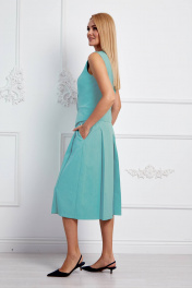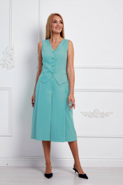 Комплект женский, состоит из жилета и юбки-брюк. Жилет укороченный, прилегающего силуэта, застёжка спереди на пуговицы, по переду и спинке вертикальные рельефы, по переду карманы-"обманки", изделие на подкладке. Юбка-брюки со складками от пояса, с боковыми карманами, застёжка по боковому шву на потайную молнию. Ширина по линии груди (42):44см (44):46см (46):48см (48):50см (50):52см (52):54см Ширина по линии бедер жилет(42):48см брюки:48см жилет(44):50см брюки:50см жилет(46):52см брюки:52см жилет(48):54см брюки:54см жилет(50):56см брюки:56см жилет(52):58см брюки:58см Ширина по линии талии (42):35см (44):37см (46):39см (48):41см (50):43см (52):45см Длина изделия жилет:49-50см брюки:74см