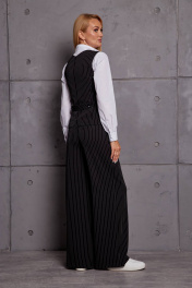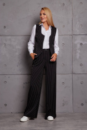 Комплект женский брючный, состоит из жилета и брюк. Жилет прилегающий, укороченный, вырез горловины фигурный, застёжка спереди на пуговицы, по переду и спинке рельефы, по спинке хлястик. Изделие на подкладке. Брюки прямые, широкие, на поясе, застёжка спереди на молнию и пуговицы, с боковыми карманами со скосом, по переду складки. Ширина по линии груди (44):45,5см (46):47,5см (48):49,5см (50):52см (52):54см (54):56см Ширина по линии бедер жилет(44):48см брюки:51см жилет(46):50см брюки:53см жилет(48):52см брюки:55см жилет(50):54см брюки:57см жилет(52):56см брюки:59см жилет(54):58см брюки:61см Ширина по линии талии (44):35см (46):37см (48):39см (50):42см (52):44см (54):47см