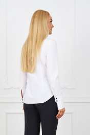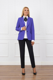Комплект женский состоит из жакета, блузки и брюк. Жакет прилегающего силуэта с вертикальными рельефами от проймы по переду и спинке, воротник отложной с лацканами, рукав втачной двушовный со шлицей по низу, застёжка спереди на петли и пуговицы, край борта по низу закруглён, по переду карманы с клапаном, изделие на подкладке. Брюки узкие со стрелками и разрезиками по нижней части боковых швов, на поясе-кокетке, застёжка спереди на молнию и пуговицы, с боковыми карманами, со шлёвками. Блузка полуприлегающего силуэта, воротник-стойка, рукав втачной на манжете, застёжка спереди на планку. Ширина по линии груди жакет(42):45см блузка:45см жакет(44):47см блузка:47см жакет(46):49см блузка:49см жакет(48):51см блузка:51см жакет(50):53см блузка:53см жакет(52):55см блузка:55см Ширина по линии бедер жакет(42):50см брюки:47см блузка:45см жакет(44):52см брюки:49см блузка:47см жакет(46):54см брюки:51см блузка:49см жакет(48):56см брюки:53см блузка:51см жакет(50):58см брюки:55см блузка:53см жакет(52):60см брюки:57см блузка:55см Ширина по линии талии (42):35см (44):37см (46):39см (48):41см (50):43см (52):45см Длина изделия (42-46): жакет-69см брюки-103см блузка-64см (48-52): жакет-71см брюки-103см блузка-66см Длинна рукава жакет-62,5см блузка-61см