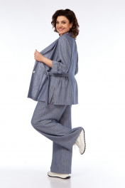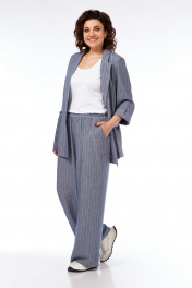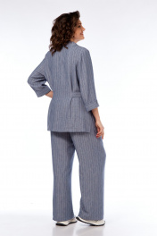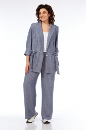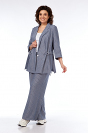 Женский двухпредметный костюм состоит из жакета и брюк, выполнен из плательно-костюмной ткани в полоску. Жакет прямого силуэта с воротником пиджачного типа и центральной застёжкой на 1 петлю и пуговицу.Перед и спинка с рельефами из плечевых швов до низа,в швов,в области талии, вставлены пояски с полукольцами. Рукава втачные двухшовные длиной 3/4 на двойных притачных отложных манжетах с разрезами по центру. Боковые швы заканчиваются разрезами.Жакет без подкладки. Брюки прямые широкие на притачном поясе с резинкой по кругу и карманами с отрезными бочками в швах.