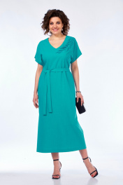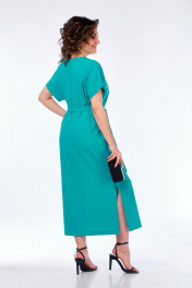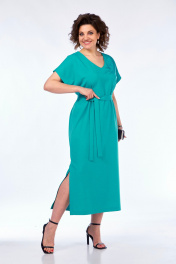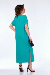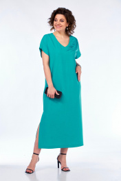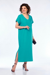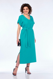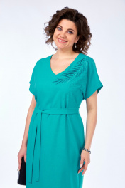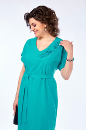 Платье женское прямого силуэта с оригинальной дизайнерской вышивкой на левом плече,выполнено из плательно-костюмной ткани с содержанием льна. Рукава цельнокроеные короткие с разрезами по плечевым швам. Вырез горловины V-образный, обработан обтачкой. Спинка со средним швом. Справа боковой шов заканчивается шлицей. Платье укомплектовано поясом-завязкой из основной ткани. Высота шлицы 41см Длина пояса 192см(58, 60, 62) и 178см(52, 54, 56)