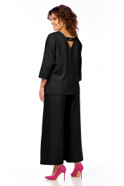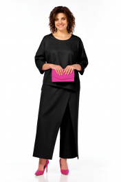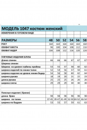 Женский нарядный двухпредметный костюм состоит из блузы и брюк с имитацией юбки спереди,выполнен из плательно-костюмной однотонной ткани с блестящим напылением. Блуза прямого силуэта.Перед с нагрудными вытачками из плечевых швов , асимметричным низом и декоративной планкой слева.Спинка со средним швом и V-образным вырезом горловины с планкой и декоративной пластинкой.Плечи спущены.Рукава одношовные длиной 3/4 по низу двойные притачные манжеты. Брюки прямые,по переду с отлетными деталями на запах, на двойном притачном поясе с резинкой по кругу.