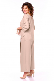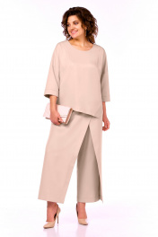 Женский нарядный двухпредметный костюм состоит из блузы и брюк с имитацией юбки спереди,выполнен из плательно-костюмной однотонной ткани с блестящим напылением. Блуза прямого силуэта.Перед с нагрудными вытачками из плечевых швов , асимметричным низом и декоративной планкой слева.Спинка со средним швом и V-образным вырезом горловины с планкой и декоративной пластинкой.Плечи спущены.Рукава одношовные длиной 3/4 по низу двойные притачные манжеты. Брюки прямые,по переду с отлетными деталями на запах, на двойном притачном поясе с резинкой по кругу.
