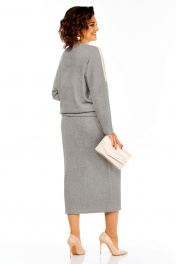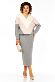 Костюм женский двухпредметный состоит из свободного джемпера и длиной юбки,выполнен из трикотажного полотна под вельвет в мелкий рубчик 3 цветов. Джемпер силуэта "летучая мышь" . Перед со средним швом и косыми подрезами от него, выполнен из 3 цветов,образуя геометрический рисунок. Вырез горловины V-образный. Спинка цельная. Рукава одношовные длинные. Низ джемпера на двойном притачном поясе. Юбка прямая, зауженная книзу, длиной ниже середины икры,на цельнокроеном поясе с резинкой по кругу. Юбка на трикотажной подкладке.