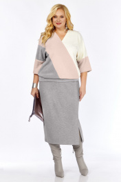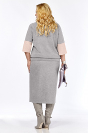 Женский двухпредметный костюм состоит из свободного джемпера и юбки с интригующим разрезом спереди слева.Костюм выполнен из трикотажного полотна в мелкий рубчик ,как вельвет,в 3-х цветах. Джемпер силуэта "летучая мышь ". Перед с диагональными подрезами,состоит из трёх частей разного цвета. Вырез горловины V-образный. Плечи спущены. Спинка цельная . Низ джемпера на двойном притачном поясе. Рукава длиной 3/4 ,низ на широких притачных манжетах. Юбка прямая, длиной до середины икры, спереди складка,которая заканчивается шлицей. Юбка на цельнокроеном поясе с резинкой по кругу. Юбка на трикотажной подкладке.