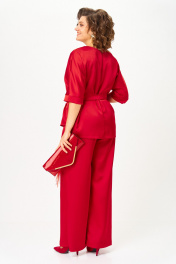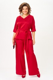 Нарядный женский комплект состоит из свободной блузы и широких брюк "палаццо". Блуза прямого силуэта с цельнокроеными рукавами "летучая мышь", выполнена из плотного сатина. Низ асимметричный,по переду закруглённый окантован ламовкой,по спинке прямой удлинённый. V-образный вырез горловины обтачен по переду и окантован ломовкой по спинке. Рукава длиной 3/4. Низ на притачных манжетах. Брюки прямые широкие на притачном поясе с резинкой по кругу, выполнен в из плотного сатина. Комплект дополнен поясом-завязкой из ткани брюк с бахромой из перьев на концах.