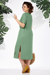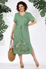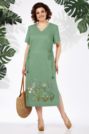 Платье женское, удлиненное, прямого силуэта, с кулисами по бокам в области талии, выполнено из плательно-костюмной ткани.Перед с нагрудными вытачками и вышивкой по низу.Спинка со средним швом.Боковые швы заканчиваются разрезами. Рукава втачные одношовные короткие.