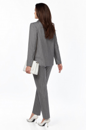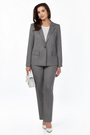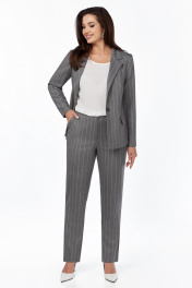 Комплект женский трехпредметный,состоит из жакета и брюк,выполненных из поливискозной плательно-костюмной ткани в полоску и блузы ,выполненной из блузочной креповой ткани. Жакет прямого силуэта,с центральной застёжкой на 1 петлю и пуговицу и воротником пиджачного типа с отложными лацканами.Перед с рельефами от плечевых швов до низа, и прорезными карманами с листочкой и клапанами .Спинка со средним швом.Рукава втачные, двухшовные,длинные .Перед жакета на подкладке. Брюки зауженные к низу,с карманами с отрезными бочками,на притачном поясе с резинкой в области боковых швов и застёжкой на тесьму-молнию и 1 петлю и пуговицу. Блуза с овальным вырезом горловины и спущенным плечом.