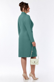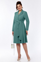 Платье-кардиган выполнено из плательно-костюмной ткани,двубортное,с застёжкой на петли и пуговицы в нижней части и завязкой на пояс в верхней части, с воротником пиджачного типа.Перед асимметричный.Правая часть переда двойная : нижняя с рельефом от проймы до низа,верхняя часть с нагрудной вытачкой и поясом.Левая часть переда с рельефом от проймы до подреза в области талии, и параллельным складками от подреза до низа . Слева в боковом шве пояс.Спинка с рельефами от плечевого шва до низа.Рукава втачные двухшовные длинные.