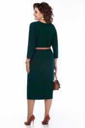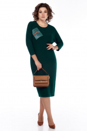 Женское платье полуприлегающего силуэта длиной до середины икры, выполнено из тонкого мягкого трикотажного полотна с рельефным геометрическим рисунком. Плечи спущены.Рукава одношовные длиной 3 / 4. По переду выполнена кожаная аппликация с дизайнерской вышивкой.Платье укомплектовано ремнем.