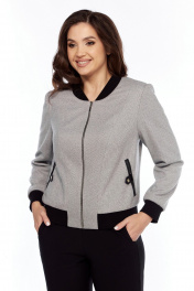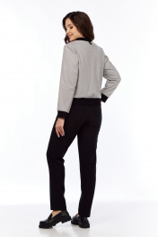 Комплект женский состоит из бомбера, выполненного из трикотажного полотна в рисунок "ёлочка" и довяза ,и брюк, выполненных из гладкой однотонной костюмной ткани. Бомбер прямого силуэта на подкладке, застежка центральная на декоративную молнию. По переду рельефы, прорезные карманы "в рамку" с патой из кожи, застегивающиеся на кнопку. По спинке на стойке отделочная пата из кожи с кнопкой. Стойка-воротник, манжеты по низу рукавов, притачной пояс по низу бомбера из трикотажного довяза. Брюки зауженные к низу,на притачном поясе из довяза с резинкой по кругу. Вдоль боковых швов вставки из основной ткани,по переду выполнены карманы с отрезным бочком.Сзади отрезная кокетка.