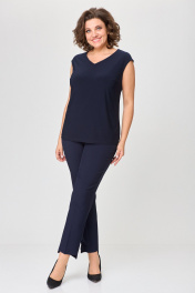 Костюм женский состоит из туники, топа и брюк. Туника удлиненная прямого силуэта. Застежка центральная на навесные петли и пуговицы. По переду нагрудные вытачки, выходящие из проймы. По бокам высокие разрезы. Рукав втачной, одношовный с кулиской по низу. Топ полуприлегающего силуэта со спущенным плечом. Горловина V-образной формы. По бокам - разрезы. Брюки полуприлегающего силуэта, зауженые к низу. Передняя и задняя половинки без вытачек по линии талии. Пояс притачной в виде пояса-обтачки с частичной эластичной тесьмой по спинке.