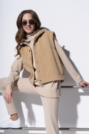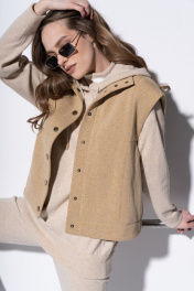 Жилет женский прямого,свободного силуэта, двойной с отделочными строчками. Воротник-стойка, центральная застежка - на кнопках. Карманы - по переду в рельефных швах. Длина: 54-58,5 см.