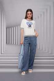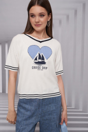 Джемпер женский, прямого силуэта. Рукав короткий, со спущенной линией плеча. Горловина V-образная По переду изделия имеется декоративно вывязанное сердце и печать.