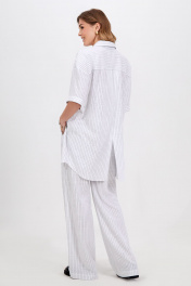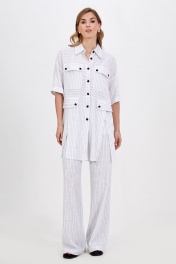 Эта рубашка свободного кроя с интересной игрой полоски создаст образу особое настроение. Модель с классическим отложным воротником дополнена застёжкой на пуговицы, накладными карманами, отделочными клапанами и разрезами. Чтобы соответствовать спущенной линии плеча, рукава укорочены и широки. Особое внимание заслуживает интересное решение спинки, создающий воздушный летящий образ. Мягкий смесовый материал на основе льна с добавлением вискозы приятен при носке. В пару к рубашке можно подобрать брюки из той же линейки.