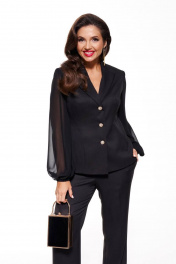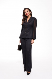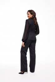 Всегда в моде брючный костюм с шифоном, стилизующий образ и придающий роскошь внешнему виду. Изделие стройнит силуэт, подчеркивает индивидуальность и лучшие стороны внешности. Стильный костюм импонирует женщинам всех возрастов по многим причинам. Красивый и функциональный, он обеспечивает удобство и комфорт в носке, не сковывает движений. Материал тонкой структуры эффектно подчеркивает естественную женскую красоту. Этот изящный костюм способен преобразить любую женщину, создав чувственный и неповторимый образ. Нарядный, с деловым акцентом, женский костюм, состоит из 2-х элементов: жакета и брюк. Костюм выполнен из костюмной смесовой ткани, в комбинации с шифоном. Жакет приталенного силуэта; однобортный; на подкладке. Передняя часть жакета с двумя нагрудными рельефами и дополнительными выточками на уровне талии. Спинка разрезная по среднему шву с двумя дополнительными выточками на уровне талии. Рукав длинный, одношовный, втачной; выполнен из шифонового полотна. Нижняя часть рукава собрана на резинку шириной 2см. Воротник модельный, стояче - отложной, пиджачного типа. Застежка центральная на три большие, декоративные пуговицы. Брюки классические, прямого силуэта. В верхней части переда присутствуют боковые, функциональные карманы. Высота сиденья классическая, высокая. Застежка центральная на молнию с пуговицей. Брюки на поясе, в задней части которого вставлена резинка для удобного прилегания по талии. С учетом плюсовых прибавок подходит на рост 170 см.