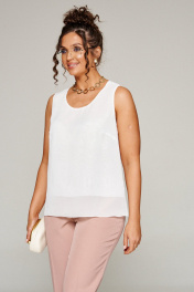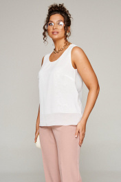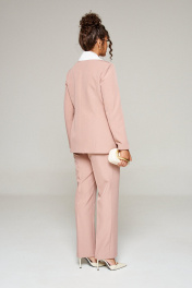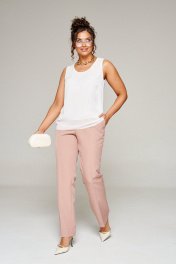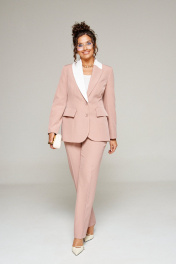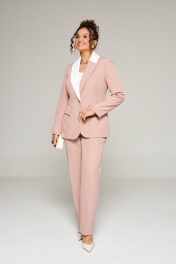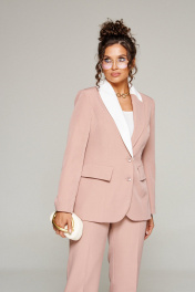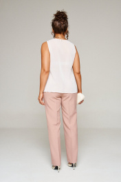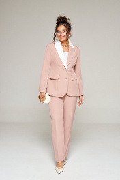 Комплект женский 3-ёх предметный: жакет, брюки, блузка в деловом стиле. Выполнен из костюмно-смесового полотна с нежной, гладко-бархатистой фактурой, приятной на ощупь и матовой поверхностью. Дополняется полупрозрачной невесомой и необыкновенно элегантной блузкой из шифоновой ткани. Жакет классический прилегающего силуэта длиной ниже бедра на подкладке. Передняя часть с вертикальными рельефами от проймы и с настроченными клапанами, имитирующими положение кармана. Спинка разрезная по среднему шву и с дополнительными вертикальными рельефами от проймы. Рукав втачной двухшовный длинный. Воротник отрезной фигурный типа «шаль», правая часть которого выполнена из ткани-компаньона смежного оттенка. Низ борта округлой формы. Застежка центральная однобортная низкая на две петли и пуговицы. Брюки классические, с функциональными боковыми карманами. Посадка классическая, высокая. В задней части пояса вставлена резинка для удобства использования. Застежка центральная на молнию и петлю с пуговицей на поясе. Блузка прямого, свободного силуэта без рукавов, выполнена из ткани типа шифон. Передняя часть блузы двухслойная цельнокроеная с вытачками от бокового шва. Спинка однослойная цельнокроеная. Вырез горловины круглый. Низ прямой.