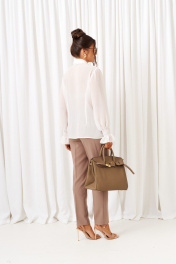 Деловой комплект 3-ка, состоящий из трех предметов: жилета, брюк и блузки. Блузка рубашечного типа выполнена из легкой, струящейся шифоновой ткани. Передняя часть блузки цельнокроеная с двумя нагрудными вытачками. Застежка центральная на петли и пуговицы. Спинка цельнокроеная с двумя вытачками на уровне талии. Нижний край блузы ровный. Воротник отложной рубашечный, на отрезной стойке. Рукав длинный одношовный втачной. Нижний край рукава декоративный с широкой оборкой. Брюки классические прямые длинные выполнены из костюмно-смесового полотна с нежной, гладко-бархатистой фактурой, приятной на ощупь и матовой поверхностью; В верхней части брюк расположены функциональные карманы. Посадка стандартная высокая. Пояс притачной с резинкой по кругу. Жилет полуприлегающего силуэта; выполнен из костюмно-смесового полотна отличительного дизайна; на подкладке. Передняя часть с вертикальными рельефами от проймы. Спинка разрезная по среднему шву и вытачками на талии от низа. Горловина округлой формы, переходящая в борт с выступом. Застежка смещенная по наклонной на прорезные петли и четыре видимые декоративные и одну потайную пуговицы.