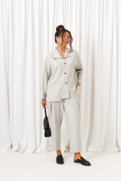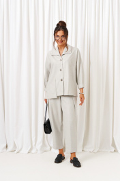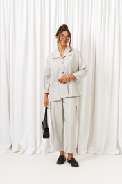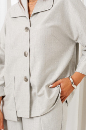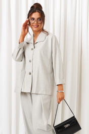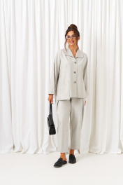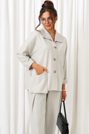Стильный повседневный женский костюм в винтажном стиле, дополненный акцентным асимметричным накладным карманом, весьма актуален в будущем сезоне. Предметы костюма можно смело комбинировать по отдельности с другими вещами гардероба. Костюм состоит из 2-х предметов одежды: рубашки и брюк. Выполнен из костюмной ткани стильного дизайна с содержанием натуральных волокон. Рубашка прямого силуэта свободного кроя. Перед из двух симметричных деталей с нагрудными вытачками от бокового шва. Асимметричность изделию придает нижний накладной карман слева фантазийной формы. Спинка цельная. Рукав рубашечный одношовный полной длины с возможностью отворота. Застежка передняя центральная на три прорезные петли и декоративные пуговицы. V-образный вырез горловины. Воротник типа «апаш», цельнокроеный с передом. Брюки прямого силуэта свободные вверху и слегка зауженные к низу, длиной до щиколотки, с двумя верхними боковыми карманами и двумя заложенными глубокими складками от пояса спереди. Высота сиденья классическая. Застежка центральная на молнию и на петлю с пуговицей на поясе. Брюки на притачном поясе, в задней части которого для удобного прилегания по талии вставлена резинка.