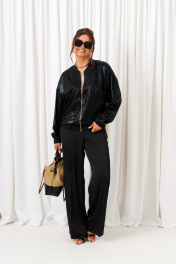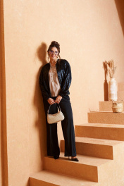Брючный комплект в комбинации сияющего роскошного атласа с эксклюзивным ворсовым шифоном не останется незаметным! Блузон свободного силуэта тип «бомбер» с удлиненной линией плеча. Перед с нагрудными вытачками от бокового шва. Спинка цельнокроеная. Рукав рубашечный одношовный длинный. Низ рукава обработан притачной манжетой с резинкой. Горловина округлой формы с плосколежащим воротником-стойкой. Застежка центральная на декоративную разъёмную молнию. Нижняя часть блузона обработана планкой с резинкой. Брюки свободного силуэта прямые, с двумя верхними боковыми функциональными карманами. Высота сиденья классическая. Застежка центральная на молнию и на петлю с пуговицей на поясе. Брюки на поясе, в задней части которого для удобного прилегания по талии вставлена резинка. Топ полуприлегающего силуэта. Перед цельный, с двумя нагрудными выточками от бокового шва. Спинка разрезная по среднему шву, в верхней части которого предусмотрен небольшой разрез для застежки на одну навесную петлю с пуговицей; с вытачками на талии. Горловина округлой формы. В боковых швах выполнены разрезы.