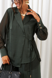 Стильный свободный нарядно-повседневный женский комплект, дополненный акцентными деталями, весьма актуален в будущем сезоне. Комплект состоит из 2-х предметов одежды: рубашки и брюк. Выполнен из легких и струящихся тканей мягких оттенков с содержанием натуральных волокон. Брюки и верхняя деталь, имитирующая жилет, из шелковистого полотна. Рубашечная часть комплекта из шифоновой ткани. Рубашка прямого силуэта свободного базового кроя. Перед двойной: из симметричных деталей внутренней рубашки и свободного внешнего жилета. На жилете расположены нагрудные вытачки от боковой линии и слева вверху настрочена декоративная деталь-листочка. Спинка цельная по середине, имеет двойную фигурную обтачку-кокетку из отделочной ткани и мягкую встречную складку от неё. Рукав рубашечный одношовный полной длины с мягкими складками по низу от притачной манжеты. Манжет застегивается на две декоративные пуговицы. Застёжка смещенная на видимую отделочную завязку на жилете и внутреннюю потайную. Воротник классический отложной пиджачного типа с лацканами. Низ слегка округлой формы с поднятием к боковым участкам. Брюки свободного, прямого силуэта. Высота сиденья классическая. Спереди на талии заложены глубокие складки. Брюки на поясе, в который вставлена эластичная тесьма по всей окружности.