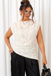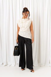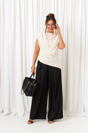 Брючный комплект в комбинации сияющего роскошного атласа с эффектным кружевом не останется незаметным! Блузон прилегающего силуэта асимметричного кроя выполнен из кружевного полотна на трикотажной основе. Блузон обработан мягкой трикотажной подкладкой. Передняя часть цельная с двумя вертикальными складками от каждого плечевого шва и двумя горизонтальными мягкими складками от правого бокового шва. Спинка цельная с двумя складками от бокового шва. Плечевая линия удлиненная, чуть приспущенная, мягко закрывающее плечо. Горловина легкой формы «качель». Застежка слева сбоку на потайную молнию. Брюки широкие фантазийного кроя со встречной складкой спереди от пояса. Высота посадки стандартная. В верхней части бокового шва предусмотрены функциональные карманы. Застежка боковая на потайную молнию слева. Задняя часть пояса на резинке, что придает изделию дополнительный комфорт при носке.