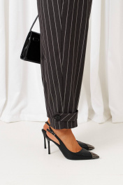 Брючный костюм из изысканного полотна в полоску идеально подходит для торжественных случаев и не только. Оба изделия можно смело комбинировать по отдельности с другими вещами Вашего гардероба. Элегантный костюм состоит из 2-х предметов одежды: жакета и брюк. Выполнен из костюмного полотна с содержанием натуральной вискозной нити классического рисунка в полоску. Жакет полуприлегающего силуэта двубортный, на подкладке. Перед с подрезом на талии, с функциональным боковым карманом с клапаном от него. Слева вверху расположена листочка. Спинка со средним швом и с вертикальными рельефами от проймы. Рукав двухшовный втачной длинный. Воротник стояче-отложной пиджачного типа с лацканами. Застежка смещенная на видимые прорезные петли и пуговицы, а также на дополнительную потайную петлю с пуговицей. Низ борта ровный. Брюки свободные, расширенного силуэта вверху и слегка зауженные к низу. С верхними наклонными глубокими складками и с двумя верхними боковыми карманами. Низ брюк оформлен декоративными патами с пуговицей. Высота сиденья стандартная. Застежка центральная на молнию и на петлю с пуговицей на поясе. Брюки на притачном поясе, в задней части которого для удобного прилегания по талии вставлена резинка. Длина жакета (по среднему шву спинки) ~ 65,5 см. Длина рукава жакета ~ 62 см. Длина брюк (с поясом) ~ 96 см.