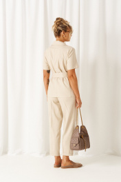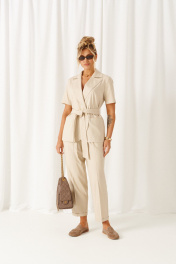 Женский льняной комплект - классический, но с выразительным характером! Созданный с акцентными деталями из ткани с натуральными волокнами, костюм подойдет для любой летней погоды и для любого случая выхода. Эффектный комплект состоит из жакета и брюк, выполнен из мягкой смесовой ткани с органическими льном и вискозой, практичен в носке. Жакет полуприлегающего силуэта, двубортный. Передняя часть из двух половинок, с вертикальными рельефами от проймы и прорезными боковыми карманами с обтачкой. Низ борта округлый. Спинка со средним швом и с вертикальными рельефами от проймы. Воротник пиджачного типа с фигурными лацканами. Рукав втачной одношовный короткий. Застежка смещенная на одну видимую петлю и пуговицу, а также на одну внутреннюю петлю и потайную пуговицу. Дополнительным элементом служит пояс-завязка. Брюки длинной 7/8, свободные в верху и заужены к низу. В верхней части с мягкой складкой от пояса, внизу с отворотом. Посадка классическая. Спереди расположены боковые функциональные карманы. Пояс притачной с эластичной резинкой по кругу, шириной 4см.