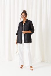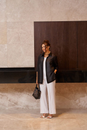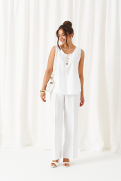 Комплект с блузкой из вуали, льняных брюк и топа – изделие вне времени и трендов, созданное в различных интерпретациях: от оверсайза до классики. Предназначен для повседневного и выходного использования. Найдет применение в жаркую и прохладную летнюю погоду. Блузка свободного силуэта выполнена из смесового полотна с содержанием вискозы. Передняя часть из двух половинок с нагрудными вытачками от бокового шва. Спинка цельная. Рукав одношовный втачной длиной ¾ свободный. Воротник классический стояче-отложной на отрезной стойке. Застежка центральная потайная. Низ изделия ровный, в боковых швах предусмотрены высокие разрезы. Топ полуприлегающего силуэта, выполнен из тонкого смесового льняного полотна. Перед цельный, с двумя нагрудными вытачками от бокового шва. Спинка цельная. Горловина округлой формы. Низ слегка закруглен к боковым участкам. Брюки длинные, прямые свободные; выполнены из смесового льняного полотна. Посадка классическая, высокая. Застежка центральная на молнию и петлю с пуговицей на поясе. Спереди расположены боковые функциональные карманы. Пояс притачной, сзади на резинке, шириной 4см.