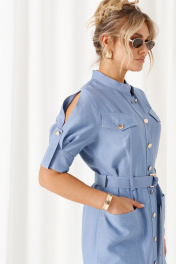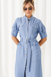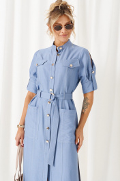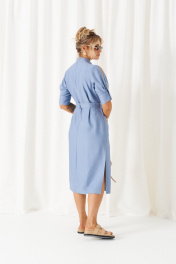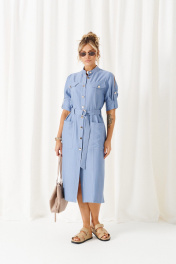 Обстоятельства, когда кажется, что нечего надеть, легко меняет льняное платье. Строгий и свободный крой с акцентными деталями, актуальная цветовая палитра стиля «деним» - всё, что необходимо для комфорта и уверенности! Платье женское полуприлегающего силуэта, длиной «миди», в строгом и практичном стиле «деним» из смесового полотна с натуральными волокнами – лен и вискоза. Перед распашной с фигурными рельефами от проймы. В верхней части выполнены клапаны с фиксацией на пуговицу. В нижней части на уровне бедра расположены функциональные накладные карманы. Спинка разрезная по среднему шву. Воротник - стойка. Рукав втачной двухшовный длиной до локтя, с оформлением низа на притачной манжете и двумя мягкими встречными складками от неё. Застёжка центральная по притачной планке на петли и пуговицы. Низ ровный, боковых швах предусмотрены разрезы. В комплекте к платью прилагается пояс на декоративной пряжке-полукольцо.