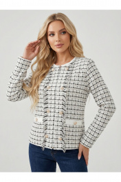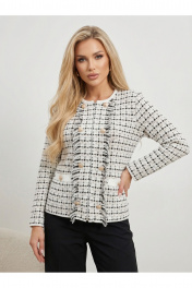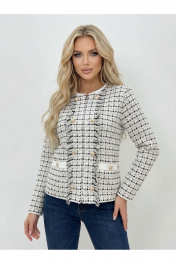 Жакет женский вязаный на пуговицах Элегантный женский жакет черного цвета в стиле Old Money — универсальная модель для создания стильных деловых и повседневных образов. Трикотажный жакет выполнен из фактурного материала, подчеркивает силуэт и обеспечивает комфорт в течение всего дня. Застежка на декоративные металлические пуговицы добавляет образу премиальности и делает модель актуальной в стиле classic и smart casual. Прямой крой, аккуратная посадка по фигуре. Модель легко комбинируется с брюками, юбками, джинсами, топами и блузками. Подходит для офиса, работы, учебы, деловых встреч, мероприятий и повседневной носки. Идеальный вариант как офисный жакет, кардиган на пуговицах, легкий пиджак женский или базовый элемент капсульного гардероба.