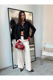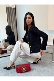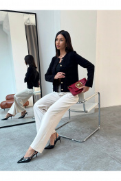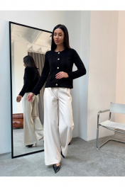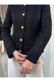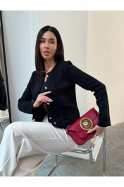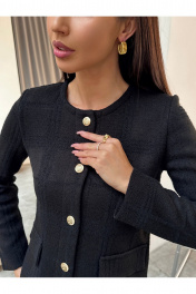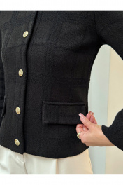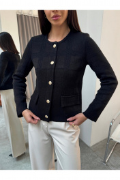 Жакет женский черный вязаный на пуговицах с карманами Элегантный женский жакет черного цвета в стиле Old Money — универсальная модель для создания стильных деловых и повседневных образов. Трикотажный жакет выполнен из фактурного материала, подчеркивает силуэт и обеспечивает комфорт в течение всего дня. Застежка на декоративные металлические пуговицы добавляет образу премиальности и делает модель актуальной в стиле classic и smart casual. Прямой крой, аккуратная посадка по фигуре и накладные карманы делают жакет практичным и функциональным. Модель легко комбинируется с брюками, юбками, джинсами, топами и блузками. Подходит для офиса, работы, учебы, деловых встреч, мероприятий и повседневной носки. Идеальный вариант как офисный жакет, кардиган на пуговицах, легкий пиджак женский или базовый элемент капсульного гардероба.