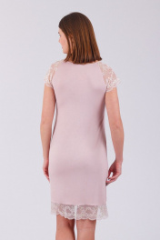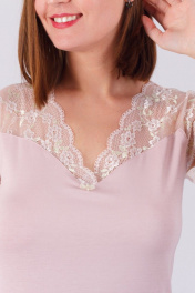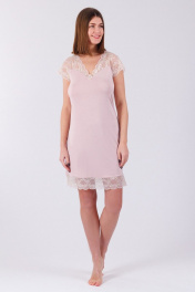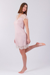 Новинка! Нежная сорочка выполнена из трикотажного полотна. Лиф сорочки, плечи и цельнокроенный рукав выполнены из эластичного биколорного кружева. Украшение - бантик с жемчужиной.