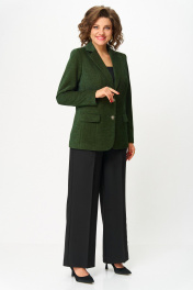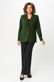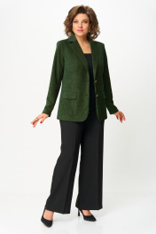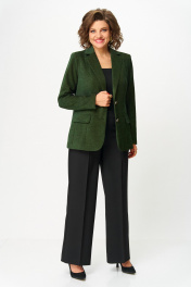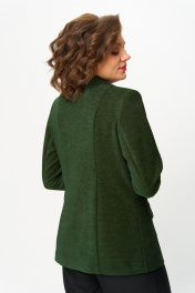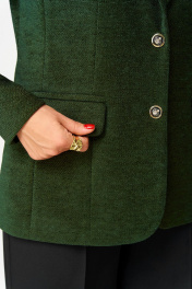 Жакет женский удлиненный, из трикотажной ткани, перед жакета на подкладке, полуприлегающего силуэта с центральной бортовой застежкой на пуговицы до линии перегиба лацкана. Спереди рельефные швы от плечевого шва, отрезной бочок и карман с клапаном. Спинка с рельефами от плечевого шва. Рукав втачной, двухшовный. Воротник пиджачного типа. Длина по спинке 70, длина рукава 61.