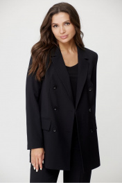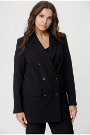 Женский комплект 2-х предметный, состоит из жакета и брюк из текстильной ткани. Жакет двубортный, свободного кроя, на подкладке. По переду имеется отрезной бочок и вертикальные вытачки. С прорезными карманами с клапаном и двумя обтачками. Спинка со средним швом. Воротник пиджачного типа. Рукав двухшовный, втачной. Длина рукава 63 см, длина по спинке 74 см. Брюки классические, прямые, заутюжены стрелки, по переду обработаны карманы с отрезным бочком, застежка на тесьму-молнию и 1 пуговицу. На задних половинках обработаны вытачки и имитация карманов с листочкой, пояс в брюках притачной, без резинки. Длина по боковому 102 см.