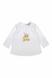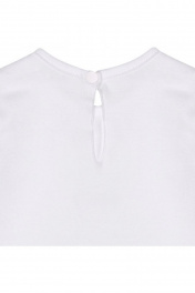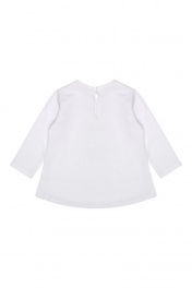 джемпер выполнен из интерлока с длинным рукавом, свободной формы с прогнутым по спинке низом. Отделкой служит рюша из шитья в перенесенном плечевом шве. Удобная застежка на спинке с перламутровой пуговицей. Декорирован цифровым принтом.