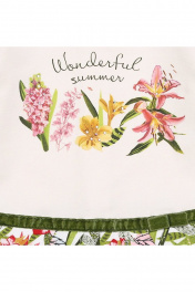 платье полуприлегающего силуэта, выполнено на комбинации однотонного и принтованного двухниточного футера с эластаном. В нижней части платья наклонные боковые карманы. Полочка декорирована цифровым цветочным принтом дополненным радужными стразами. Завершенность образу придает бархатная тесьма с бантиком по шву притачивания юбки. Для удобства надевания обработана потайная молния по среднему шву спинки.
