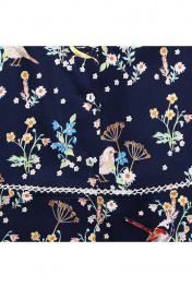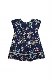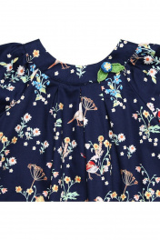 платье из набивного сатина, расширенное, А-образного силуэта, с коротким рукавом - реглан. Платье на кокетке со сквозной застежкой сзади на петли и пуговицы в форме цветочков. По переду выполнены 3 бантовые встречные складки у кокетки, по рукавам – сборка. Низ изделия соединен с каймой контрастной декоративной строчкой, выполненной в технике вязания крючком. Декор расположен ассиметрично на кокетке – маленькая.
