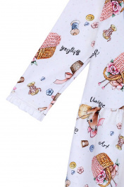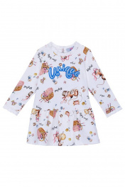 Платье для девочки с принтом свободного силуэта имеет заниженную линию талии, длинный рукав и круглый вырез горловины. Рукава и воротник изделия украшены кружевом. Трикотажная ткань футер гарантирует износостойкость и приятные тактильные ощущения.