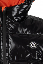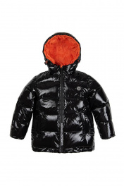 Куртка для мальчика на синтепухе прямого силуэта дополнена капюшоном с высоким воротником, манжетами на рукавах, застежкой молнией и небольшой нашивкой на груди. Ткань плащевая таффета с виниловым покрытием не пропускает влагу и имеет характерный блеск.