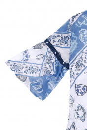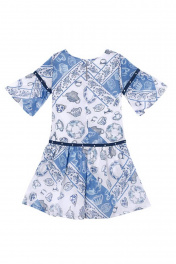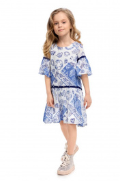 Набивное платье для девочки А-образного силуэта. Рукав с оборкой. Декор в виде киперной тесьмы и бусин "жемчуг". Оформление в стилистике капсулы "Чаепитие в саду".