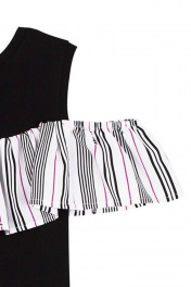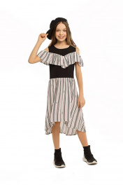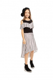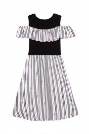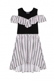 Отрезное по линии талии комбинированное платье для девочки в полоску. Открытые плечи, волан, удлиненная спинка. Дизайнерское оформление в стилистике капсулы "На своей волне".
