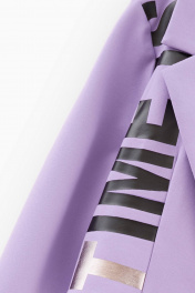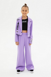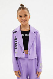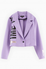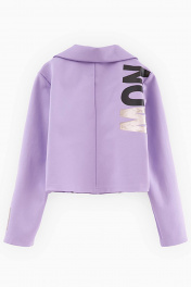 Укороченный жакет в трендовом оттенке цифровая лаванда. Застёжка на чёрную прорезиненную кнопку. Отложной воротник пиджачного типа. Изделие декорировано авторскими блестящей и матовой плёнками. Отличный образ с артикулами 240205 и 240222 или 240206.