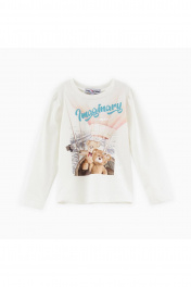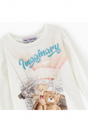 Лонгслив молочного оттенка для девочки. Модель прямого силуэта. Романтичная сборка в области плеча. Эластичная горловина из рибаны. Лонгслив декорирован дизайнерскими принтами и фразами.